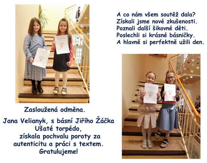 A co nám všem soutěž dala? Získali jsme nové zkušenosti. Poznali další šikovné děti. Poslechli si krásné básničky. A hlavně si perfektně užili den.