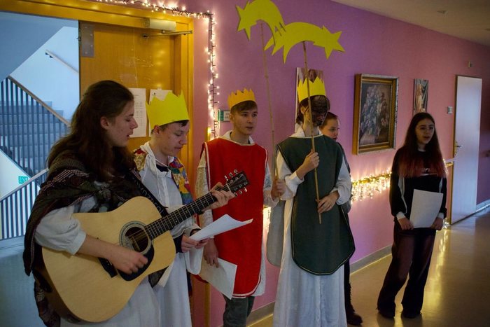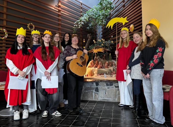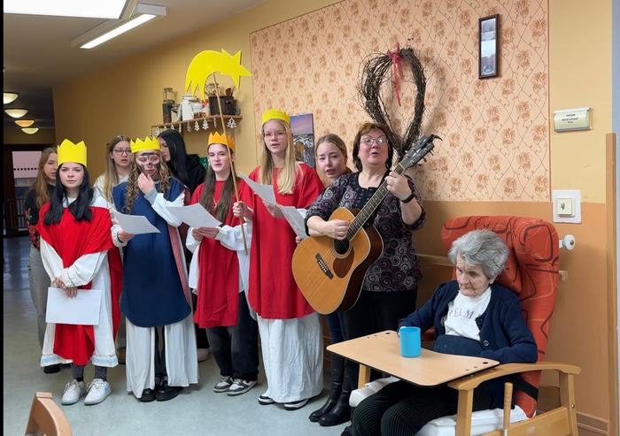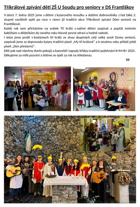 V úterý 7. ledna 2025 jsme s dětmi z kytarového kroužku a dalšími dobrovolníky z řad žáků 2. stupně navštívili opět po roce v rámci již tradiční akce Tříkrálové zpívání Dům seniorů na Františkově.